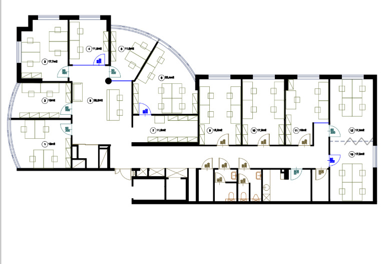 Office on the 6th floor arranged in a study layout, work rooms of various sizes. Designed for one tenant. Bathrooms and kitchen are located on the surface. The owner plans to refresh the space for the new tenant. Office available from October.