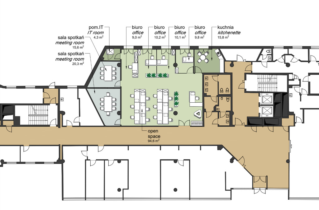Office space located on the ground floor of a 5-story building. The office comprises a large open space, two meeting rooms, four smaller office spaces, a kitchen, and a server room. The current office layout can be changed in consultation with the landlord. Maintenance costs of PLN 36 net per square meter are included in the rent. Parking spaces are available for rent at EUR 90 net per month per parking space.