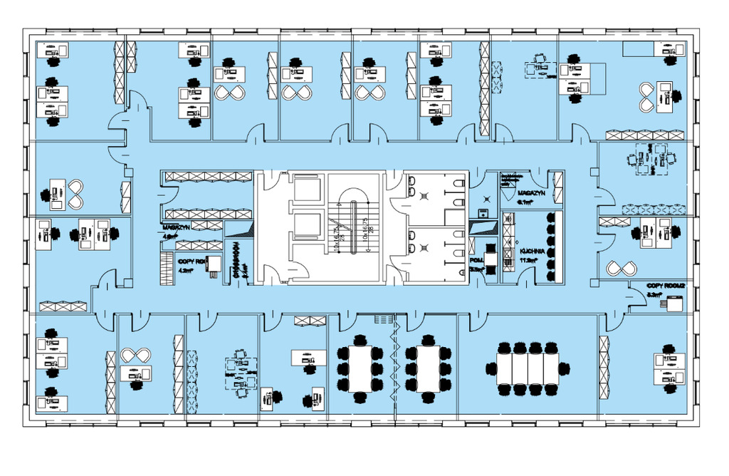 Przestrzeń jest w układzie gabinetowym - zgodnie z załączonym rzutem (rozmieszczeni biurek jest przykładowe, jest możliwość zwiększenia ich ilości).