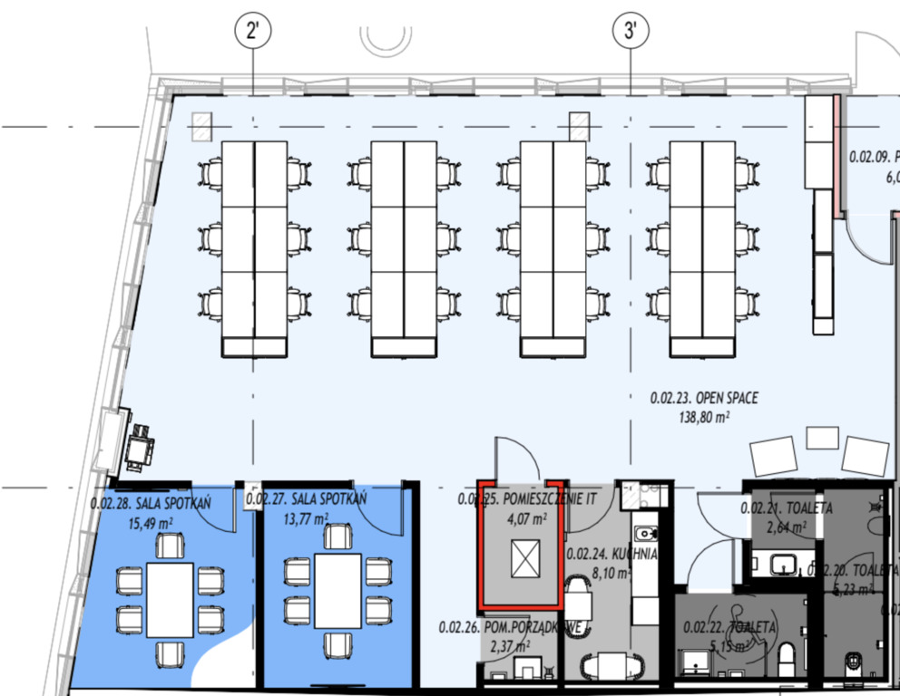 Proponowany lokal biurowy o powierzchni 213,17 mkw. netto (232,68 mkw. brutto) zlokalizowany jest na parterze. Całość wykończona i umeblowana w standardzie po wcześniejszym najemcy. Biuro to składa się z: