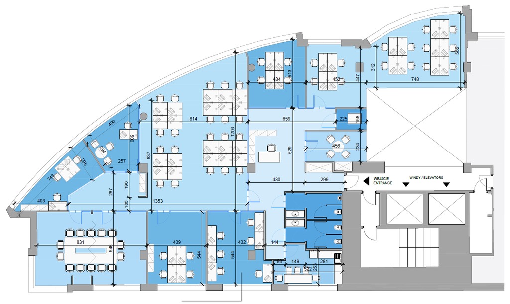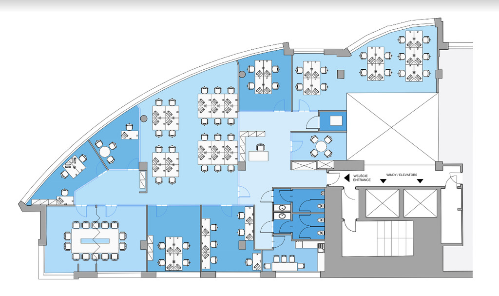 Biuro w układzie mieszanym na 1 piętrze biurowca na ok 50 stanowisk pracy. Powierzchnia składa się z części open space, zamykanych gabinetów oraz salki spotkań. Na powierzchni znajdują się liczne przeszklenia. Dostępne są również prywatna kuchnia oraz toalety.