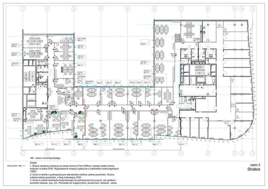 Układ: System mieszany – gabinetowy + open space, gotowe sale konferencyjne